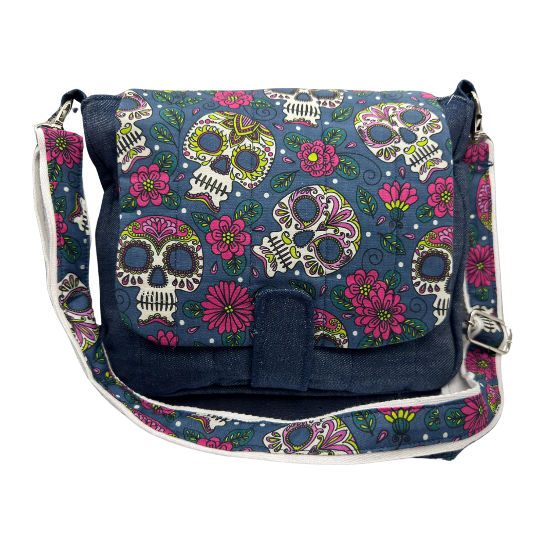 Linda bolsa em jeans com detalhes exclusivos em tecido estampado com charmosas caveiras mexicanas. Possui alça ajustável, permitindo uso lateral ou transversal, garantindo praticidade e conforto com muito estilo. Um acessório único para compor looks descolados e cheios de personalidade!