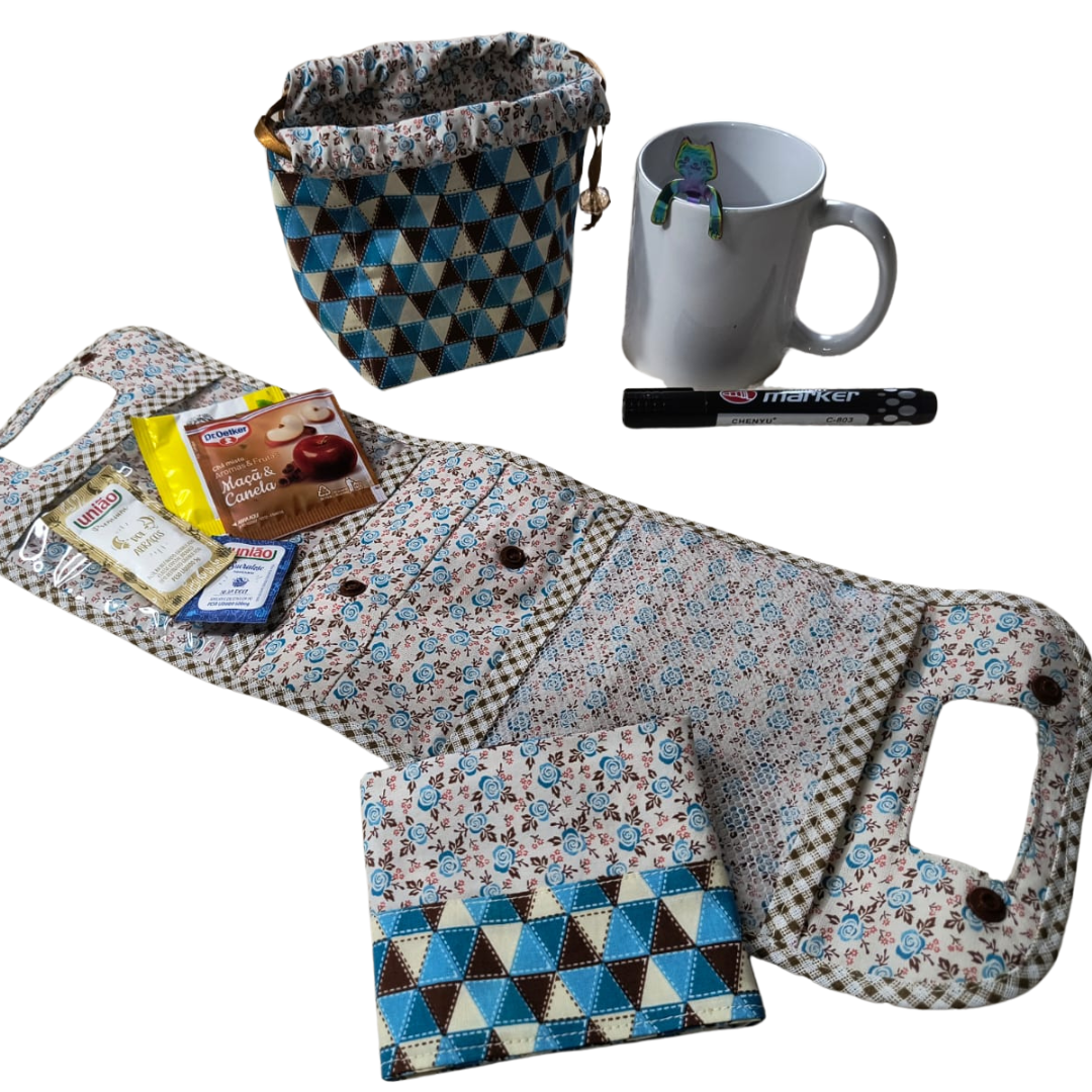 Trata-se de um kit contendo uma bolsinha com dois bolsos internos + 1 toalhinha de chá + 1 caneca branca em cerâmica + 1 cestinha/cachepô para guardar a caneca e depois vira um porta biscoito + 1 caneta para cerâmica e 1 colher .